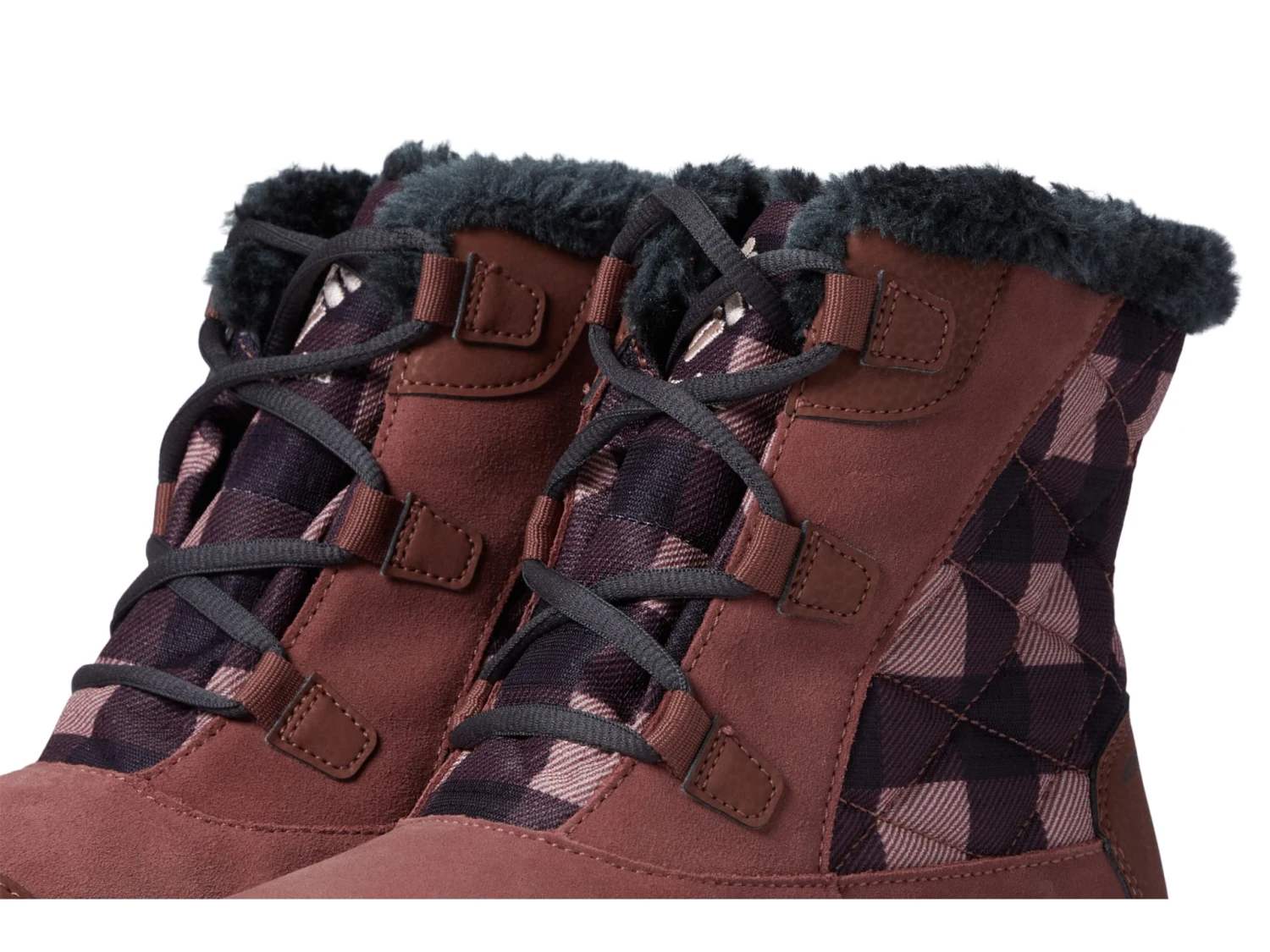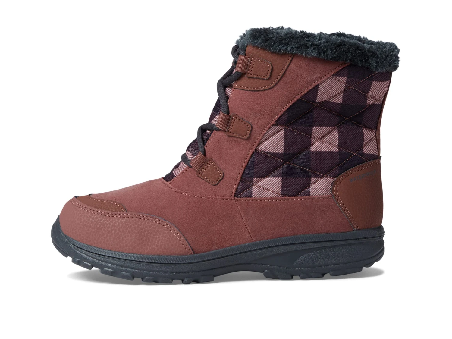 - Faux-fur collar and tongue lining for comfort, warmth, and style.