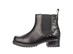 - Full grain leather upper with metal studs outlining gore panels.