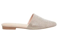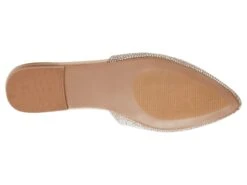 - Slide-on flat with rhinestone upper and pointy toe. Open back.