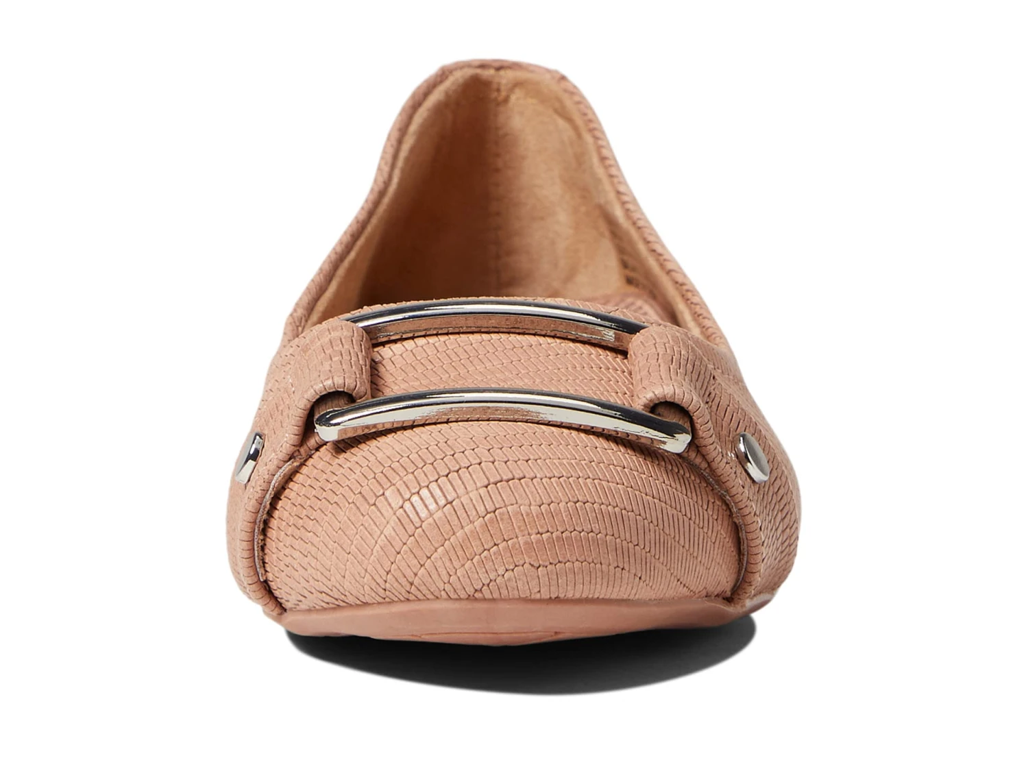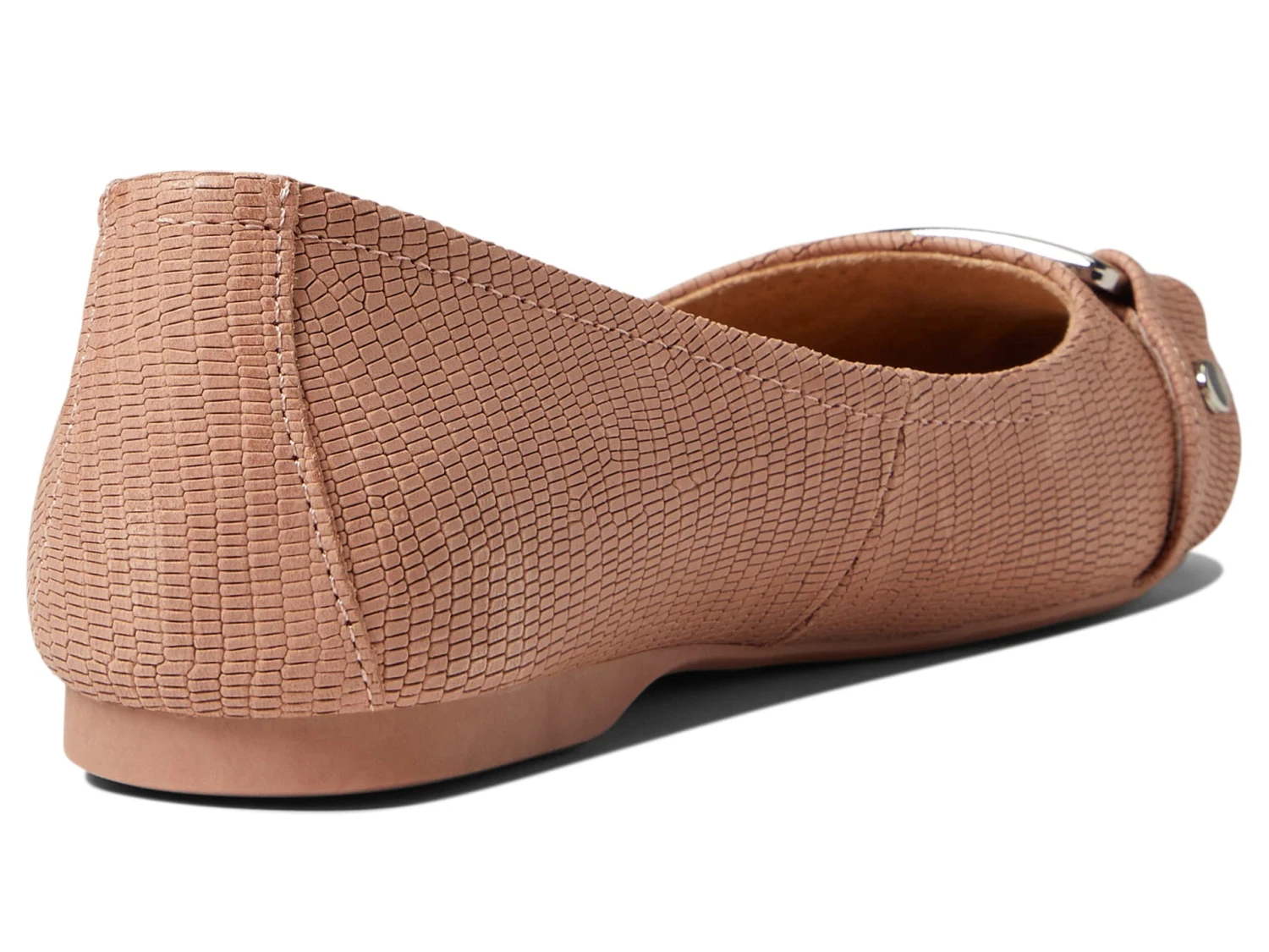 - Silvertone stud and buckle detail on the vamp.